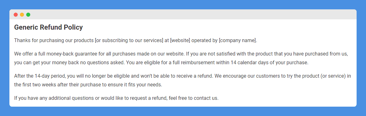 PRO TIP: Take the hassle of writing your own refund policy away with our refund policy generator trusted by over 200,000 businesses. It’ll save you hours of work and help increase sales in minutes.