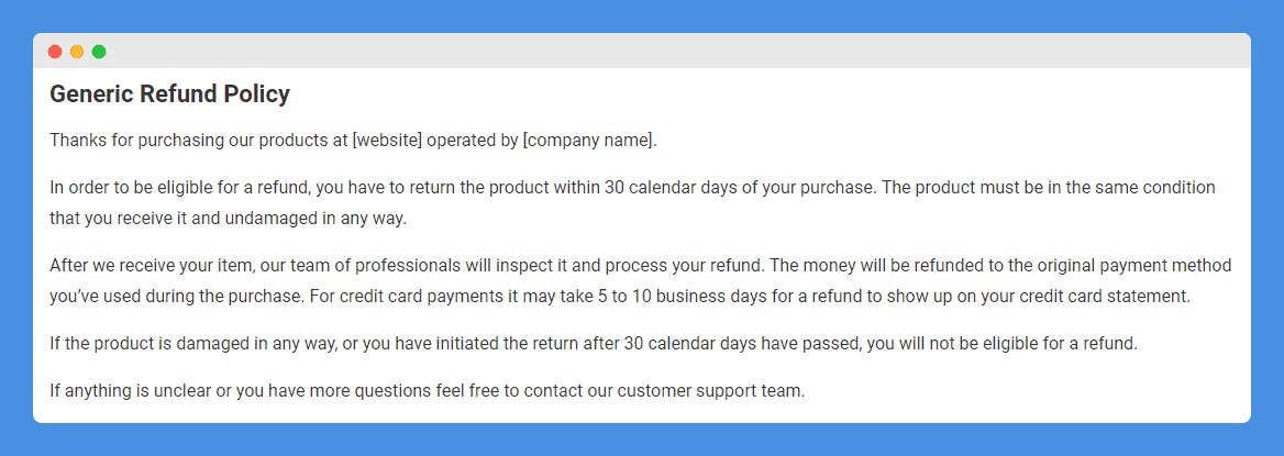 If you ask me, using a return and refund policy generator or template is the most practical and time-efficient way to create a customer-friendly policy that matches your unique business needs.